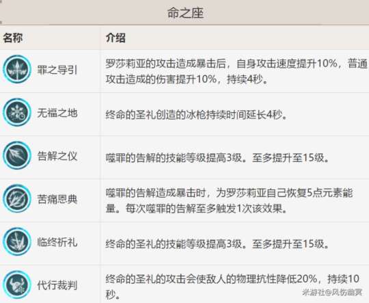 突破4后,使用Q技能后,会根据其暴击率的15%来提升队友的暴击率。不过最高提升效果不会超过15%。也就是说,即使罗莎莉亚的暴击率已经超过100%,队伍暴击率的提升也不会超过15%。