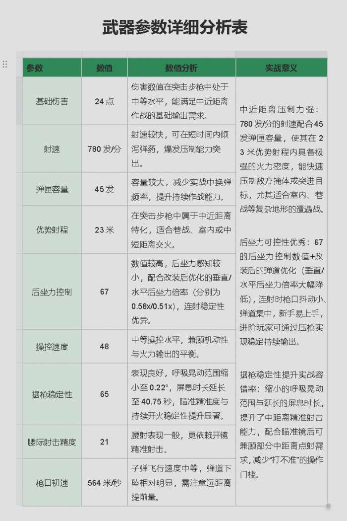 适合玩家:新手/进阶玩家:后坐力控制与稳定性优异,操作门槛低,新手能快速掌握射击节奏;进阶玩家可利用高射速和弹道集中特性,在近战中发挥火力压制优势。