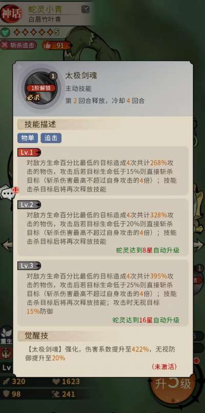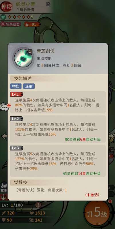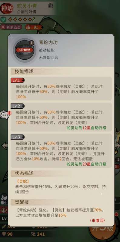 而技能三是属于小青的被动能力,也是根据竹叶青体质效果带来的基础数值提升,在这里攻击以及生命上面都有一定的百分比提升,同时小青更好用的被动还是技能四,利用青蛇内功这个被动,可以让小青在每个回合一开始的时候给自己带来60%的概率触发灵蛇的效果,这个灵蛇的效果当中可以给她带来的状态,其实是根据暴击以及伤害数值上面有20%的提升效果之后,闪避能力上面还有30%的提升,同时对于免疫控制来说,小青还可以持续多一个回合的能力,此时如果小青生命数值是低于50%的情况下,那么这个灵蛇状态触发的概率会提升到100%,所以一般情况下在战斗的中后期,小青被敌人攻击到生命数值只剩一半的情况下,她的这个被动是一定会触发到的。