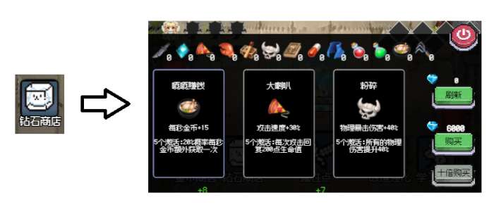 在战斗过程中,我们也会不断获得钻石,使用钻石去钻石商店消费,可以短期内获得大额的属性,单个钻石商品在到达五级后,会激活额外的效果