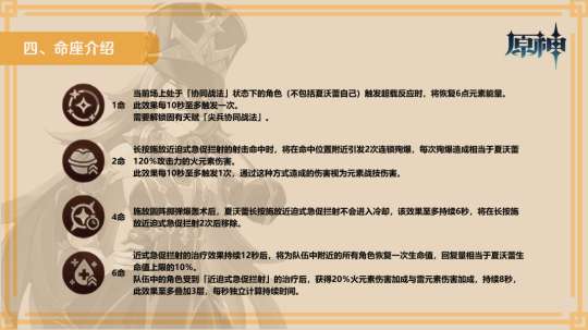 第二个效果是,只要接受过E技能治疗的角色,其火属性和雷属性的伤害提高20%。这不包括前面提到的全队回血效果。