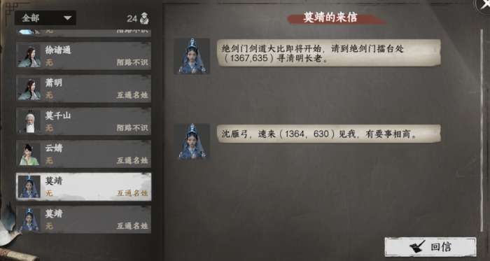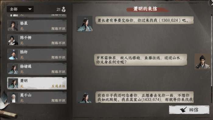 做悬赏任务将门派好感提升到25时收到萧明发来飞鸽,如果不在飞鸽里的位置可以回信询问位置过去找他