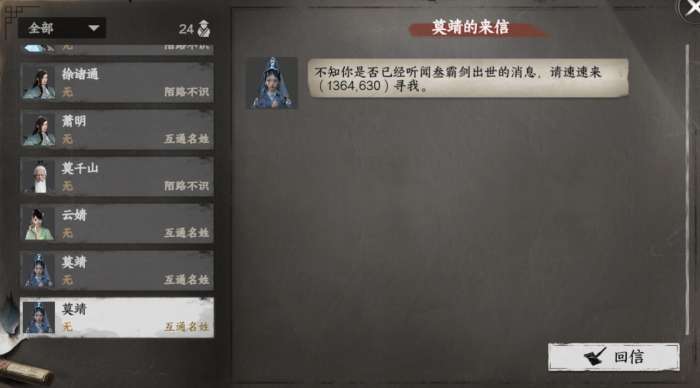 做悬赏任务将门派好感提升到100时收到莫靖飞鸽