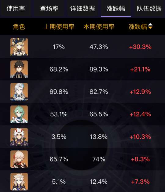 从最终深渊的使用率涨幅榜可以看出,不少岩系角色使用率都有很大的涨幅,其中娜维娅的使用率涨幅高达30.3%,钟离也有21.1%的涨幅。就连荒泷一斗和阿贝多也有不小的涨幅。