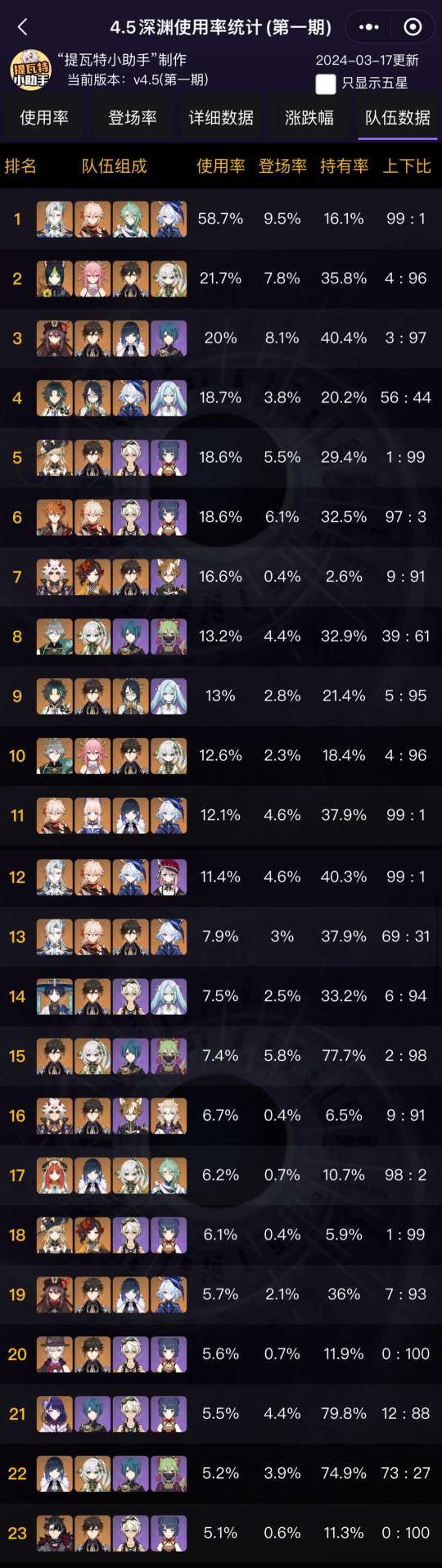 第二名则是在上期深渊非常好火的“提八妲钟”,由于这支队伍里面有钟离,因此在这期深渊非常适合下半,可以看到96%的玩家都选择走下半。