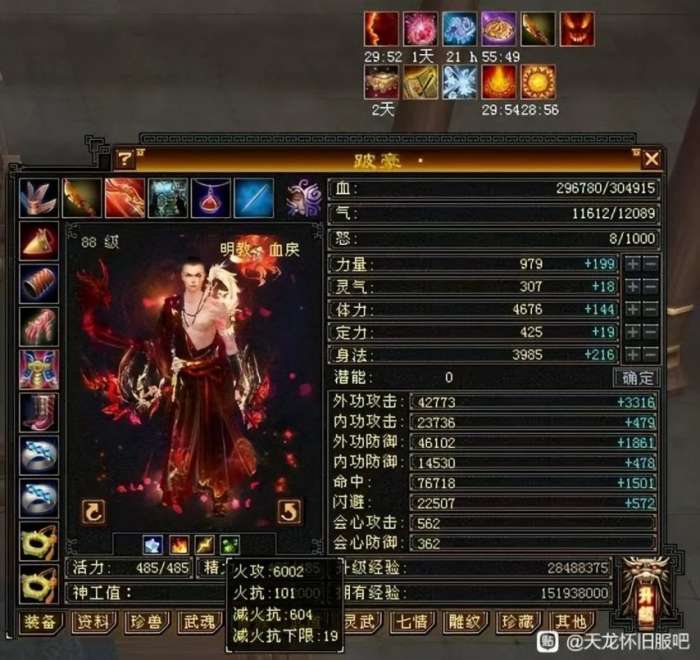 来看看跛豪的最新面板:血量30万,蓝量1.2万,外功攻击4.2万,命中7.6万,闪避2.2万,会心攻击562,会心防御362,火攻击6002!