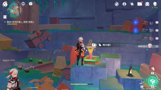 ▶按图中指引路线走,拾取“积木炸弹”,利用“魔线飞行”,前往安装于“积木矿石”上;