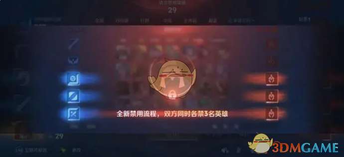 但是到了新赛季当中,就不再是你禁用一个,对面禁用一个了,而是双方同时禁用3名英雄。