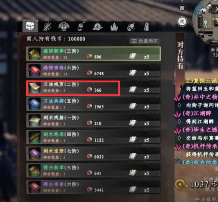 书画商除了在淮陵之外,还有可能在枰栌城(929,769),这里的书画商主要出售的是书戒残页,不过玩家需要注意,如果想要快速的找到枰栌城的书画商,玩家就需要不断的刷新或者说是刷新的次数比较多的时候,他就会出现。玩家如果想要获得的话,可以将其运用在合成高阶武学或者是完成隐藏任务。另外玩家如果在云潇山庄(738,524),这时候想要获得剑术宝册,此时也可以去云潇山庄庄那里寻找到书画商,获得之后,玩家就可以利用它来有效地提升提升剑类武器,并且能够让自己的速度变快。这里需要提醒众多玩家的是如果在云潇山庄,想要购买对应的物品时,玩家要有足够多的金钱。