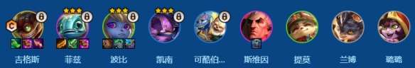 1、前期解锁凯南之前6级5约德尔搭配任意护卫(最好是尼蔻),解锁凯南后卖掉护卫牌,6级6约德尔。