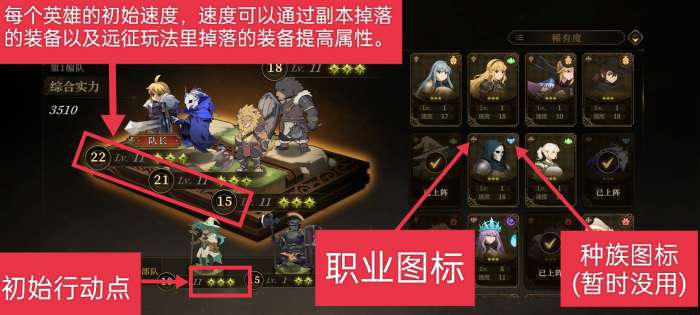 每个英雄的初始速度,速度可以通过副本掉落的装备以及远征玩法里掉落的装备提高属性。