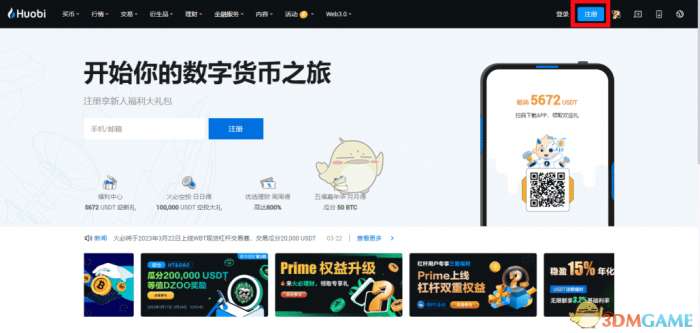 1、打开币火网官网,在上方点击【注册】。
