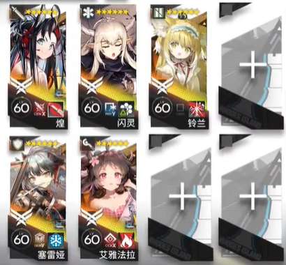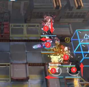根据示意图,开始游戏后先将艾雅法拉卡片朝向下方部署,接着将煌卡片朝向左侧部署,再部署塞雷亚卡片。接下来,在下方高台上将闪灵卡片朝向上方部署,再将铃兰卡片朝向左侧部署。