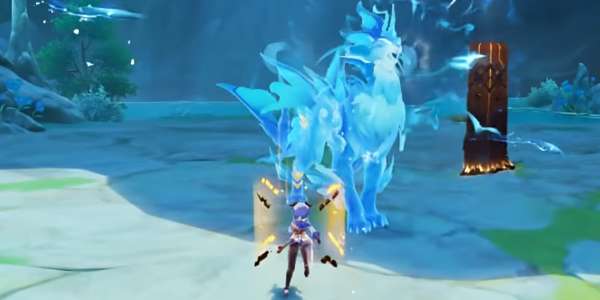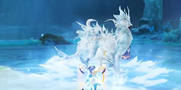 2、接着我们进入战斗,在战斗中隐山倪兽会释放一个水元素的技能,屏幕中间会出现提示,让我们使用冰元素角色(神里绫华、甘雨等)将其冻结。