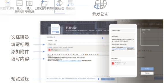 3、点击之后然后在网页中可编辑公告内容及样式,添加附件文件等,编辑完成后点击预览确认无误后再发送,发送成功后学生可以手机端进行实时查看。