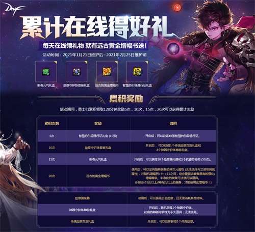 伴随着新春版本的正式上线,各色新春活动也全面开启,通过多样化的参与模式以及精彩有趣的规则,令勇士轻松收获多重福利。其中,1月21日—2月25日,勇士们每天累积在线30分钟、60分钟、90分钟、120分钟可获得相应奖励。累积领取120分钟奖励5次、10次、15次、20次还可以获得智慧的引导通行证礼盒、勋章守护珠套装礼盒、新春元气礼盒、远古的黄金增幅书等神秘大礼。