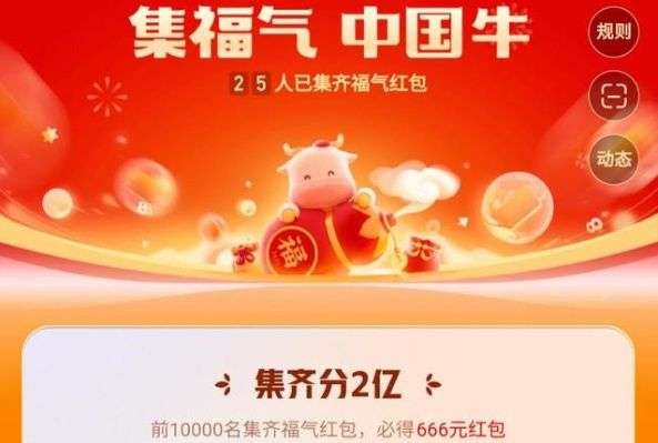 在集福气活动中,大家需要收集财气,人气,豪气,和气以及运气五张卡。如果收集5种祝福卡,则可以合成祝福牛卡和合成一个福气红包,综合用户可以在新年前夜的凌晨零点瓜分一亿。