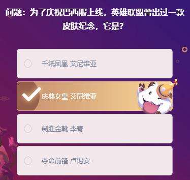 问题:为了庆祝巴西服上线,英雄联盟曾出过一款皮肤纪念,它是? 答案:庆典女皇艾尼维亚