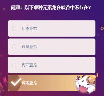 问题:以下哪种元素龙在峡谷中不存在? 答案:淬毒亚龙