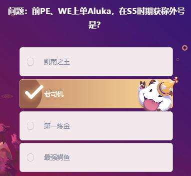 问题:前PE、WE上单Aluka,在S5时期获称外号是? 答案:老司机