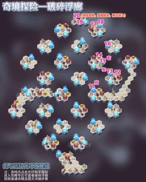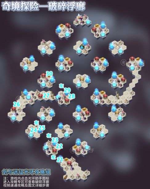破碎浮廊是国服奇境探险的第二十六个副本,正式服于3月11日上午8点开放。重要奖励有英雄选择箱*1(包含管家、老鼠、索罗斯、奈拉、芙雷拉、种族抽*10 ) 、普通抽*10、升腾秘符选择箱*10、原初秘符*20、增幅秘符*20、蓝碎*360以及若干金币、经验、粉尘。本次副本难度中等偏上。下面是破碎浮廊的速通攻略,分为三个部分,地图导航攻略和图文详解攻略以及精英怪打法建议。