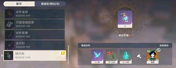 捕风瓶的制作需要飓风之种、塞西莉娅花和水晶,材料还是比较贵的,制造的捕风瓶是永久的。