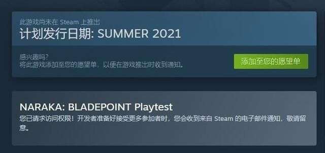 steam页面的测试资格要比国内的激活码容易许多,玩家需要在《永劫无间》的商店页面,点击愿望单下方的【NARAKA:BLADEPOINT PLAYTEST】请求访问权限。