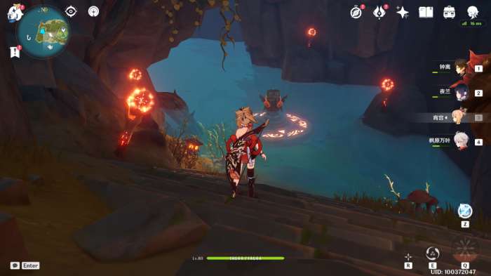 3、进入洞之后呢,我们顺着小路,来到火元素方碑前面,先点亮四个火把,再激活方碑