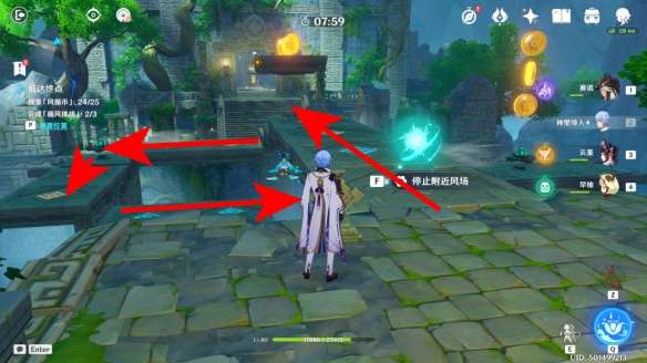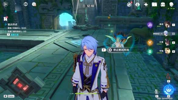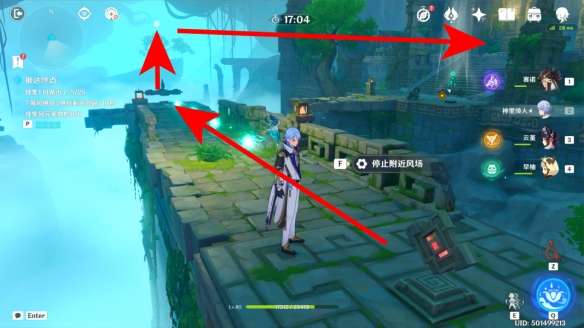 在绫人所站位置可以看到第二个挑战点,开启挑战,启动「止风枢」,收集完微粒后通过调整「拦风枢」的朝向往上飞。