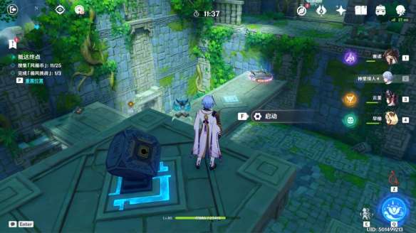 此时我们还差一个币能完成收集风寻币的任务。我们回到「止风枢」的位置,启动它,沿路调整「拦风枢」朝向,拾取最后的六枚风寻币。
