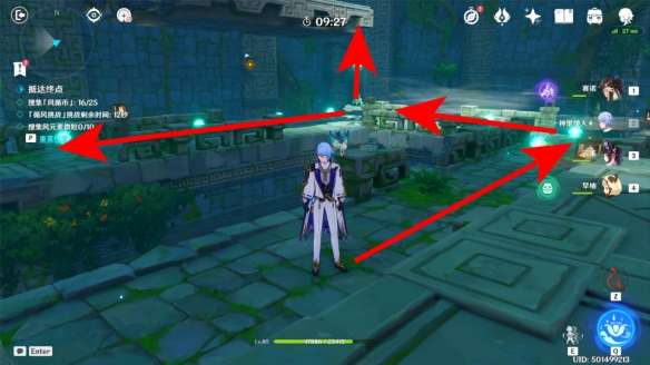 先停止风场,开启第三个挑战,沿箭头方向拾取微粒,完成挑战后飞上来。
