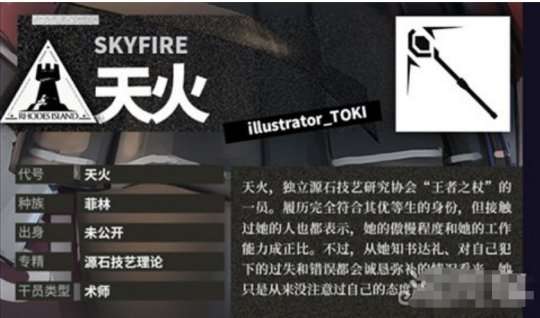 在游戏的设定中,天火来自名为“王者之杖”独立源石技艺研究协会。作为一个优等生和某种意义上的天才,她拥有普通人无法理解的源石技艺理论知识。但相对的,她也像所有天才一样,难以与人交往。但她的工作表现却难以让人挑剔。天才的思维总是让一般人难以理解。但从她坦率的待人方式来看,天火至少不是像一些人认为的那样难以相处的人。