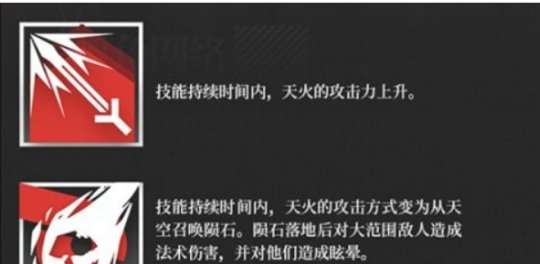 经过火神晋升之后,天火将获得新的二技能“天坠之火”。该技能的效果是,天火可以从空中召唤陨石火球,对范围内的敌人造成法术伤害并使他们陷入眩晕。这个技能不仅具有输出的作用,还可以控制敌人。因此,天火在团队中的地位比一般的术士干员更加强大。