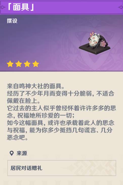 后续版本更新,在鸣神大社的巫女处,玩家与之对话可以获得花散里面具的摆设。