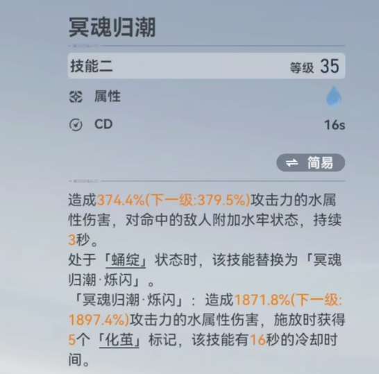 二技能则可对目标造成374%攻击力的水属性伤害,并附加“水牢”状态,持续时间为3秒。当角色处于“蛹绽”状态时,该技能将转化为“烁闪模式”,进一步增强其控制与输出衔接能力。