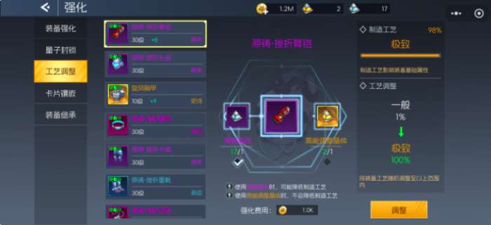 第三部分是工艺调整,去该部分对于装备基础制作十分重要,在工业制造上是1%~100%的随机摇摆,玩家初期是无法确定具体的制造工艺等级,但如果有晶核加持,能够大大提升工艺优良程度,也能够让玩家制作出更高端的基础装备。