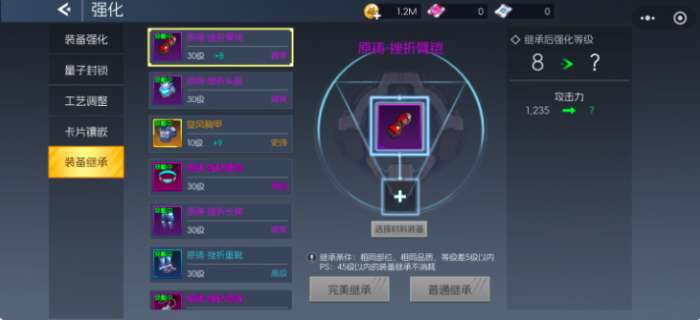 第五部分是装备继承,玩家要想完成装备的继承,需要记忆芯片和完美记忆芯片,在第一部分当中提及到了这两种芯片,这两种晶片在第五部分中可谓是核心,这两种芯片一方面可在关卡中获得,另一方面可用卡片晶核合成。