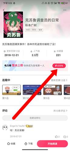 1、打开这个作品的详细界面,这次我们不是要选择看第几话,而是要点击中间的【去发电】。