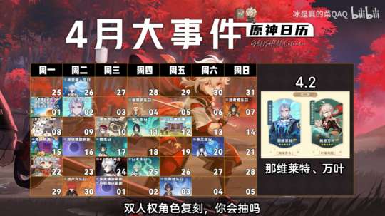 然后来看看同一个UP设计的4月大事件日历。1号全部刷新,别忘记兑换粉球。4月12号4.6前瞻直播,全新版本将要上线,300兑换码等待玩家。4月22号有新的立绘,预计有1~3张不等,具体还要看卡池安排。24号4.6版本正式上线,然后又进入到全新的长草期中。