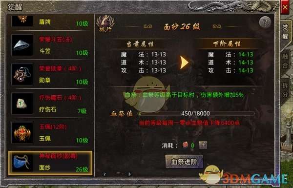 4、面纱的觉醒比较特殊,需要血祭结晶,全服面纱血祭等级排名第1、第2、第3、和4-10的角色会获得额外的5%、4%、3%、1%的血祭伤害加成。