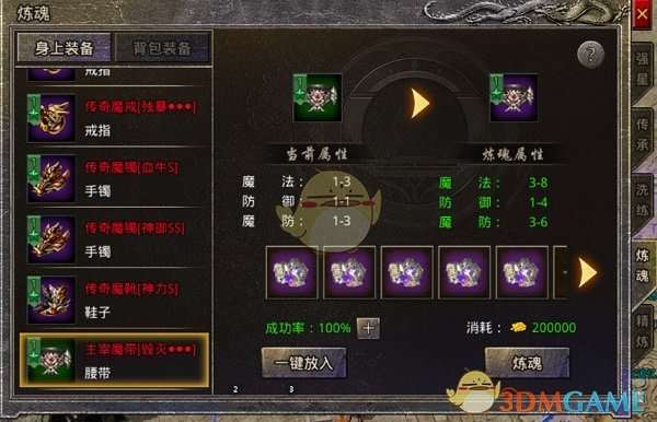 1、开服12天且角色50级以上开启炼魂功能,仅可对火龙及以上装备进行炼魂。