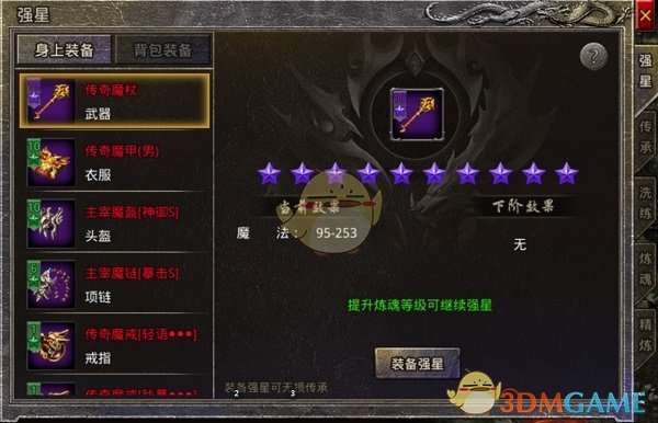 1、游戏进行到中后期,当失去装备时就需要对更换的新装备重新进行强星、炼魂、精炼,这时候可以提前准备一个已经强化完成的低品质装备等到需要时进行传承。