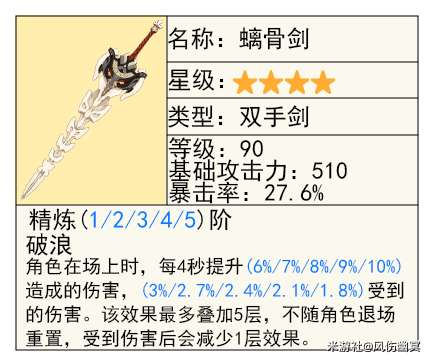 这把剑是非常强大的武器,老玩家都知道。推荐萌新小伙伴们使用它作为五星大剑。只需要注意在每次打斗之前叠加剑的层数,并搭配护盾来防止失去层数。或者,后备角色也可以先叠好层数再下场,这样即使没有护盾也可以戴上。这把大剑的特效对于任何输出角色都非常有用,无论是攻击力、生命值或者其他的输出角色。