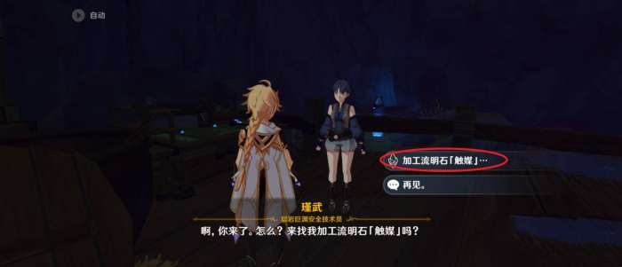 2、然后与瑾武对话,对话内容点击第一个加工流明石触媒。