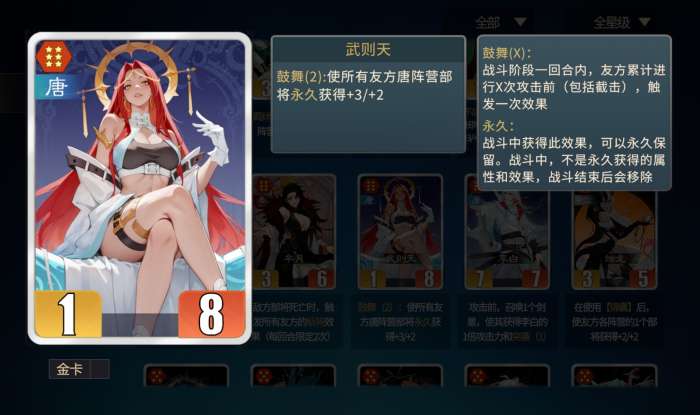 那么武则天究竟强在哪里?关键在于她的“鼓舞”技能机制。该技能能够持续提升所有大唐阵营单位的战斗属性,形成越战越强的正向循环。这种增益效果会随着战斗时间推移不断叠加,如同雪球般越滚越大,使得我方整体战斗力远超对手。因此,在使用武则天时,应优先考虑将她升至金卡品质或增加同名卡牌数量,以确保其辅助能力稳定释放。