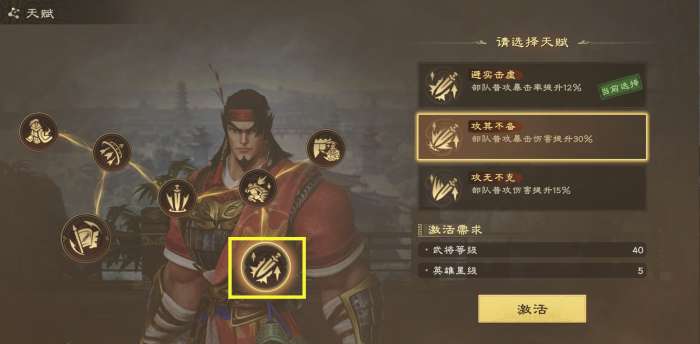 如果走暴击伤害流,可以选择攻其不备,能有效增加暴击伤害;如果搭配普攻流武将(比如孙权),就选攻无不克,可以增加部队的普攻伤害;常规技能路线,就选择避实击虚(强化暴击率伤害),最后一个天赋可基于战场需求灵活选择。