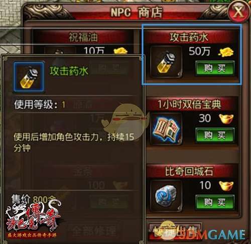 攻击药水可以在随身商店中花费50W金币购买,使用后会在15分钟内提高角色的攻击力。我们打怪赚金币是为了什么?当然是花掉啊!购买攻击药水绝对不花冤枉钱!