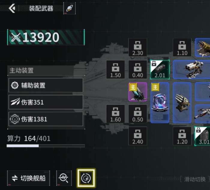 若新舰船已入库却暂时缺乏升级资源,可利用拆解与重置机制回收先前消耗的材料。只需进入舰船的武器装配页面,并点击图中标识的按钮,即可进入资源返还界面。
