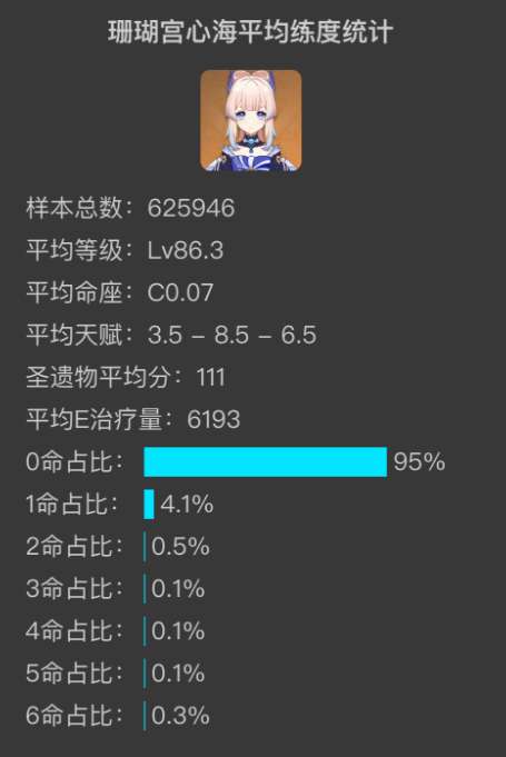 珊瑚宫心海已经连续多个版本稳坐人均命座最低的宝座,平均命座仅有0.07,因此可以看出珊瑚宫心海基本上是人均0命。虽然已经复刻多次,但基本没有人去抽命座。