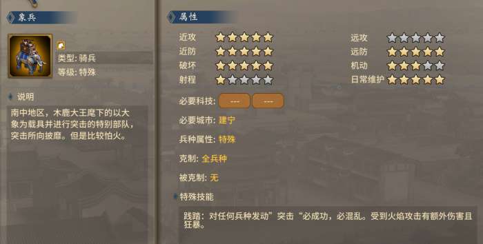 特性武将:木鹿大王(伤害太高了!象兵的属性栓条狗都能踩死敌军,缺点:怕火)